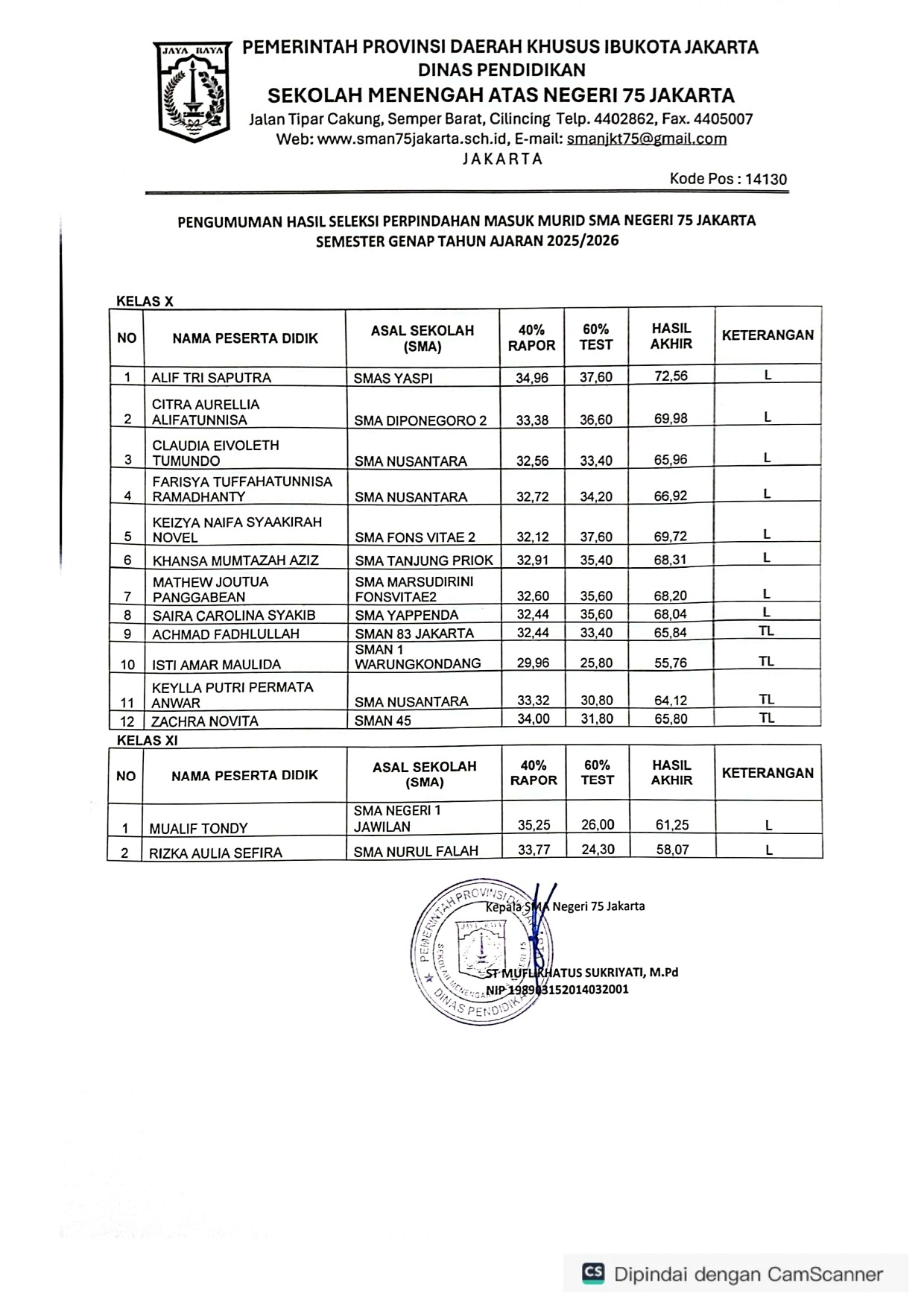 Berikut adalah hasil seleksi perpindahan masuk murid SMA Negeri 75 Jakarta.